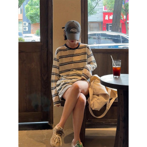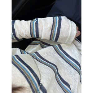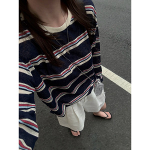 春秋chic韩版复古条纹撞色薄款长袖T恤女宽松慵懒夏日防晒衫上衣