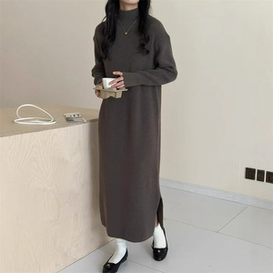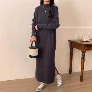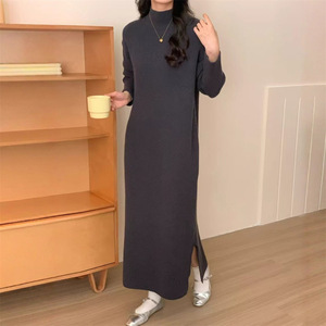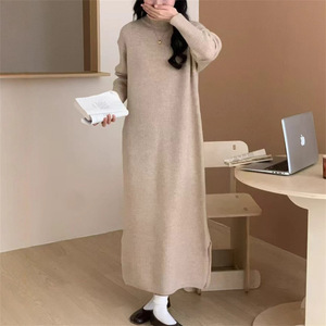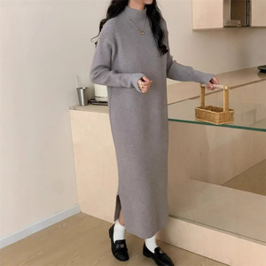 纯色半高领针织打底长裙秋冬新款配大衣内搭过膝长款毛衣上衣外搭