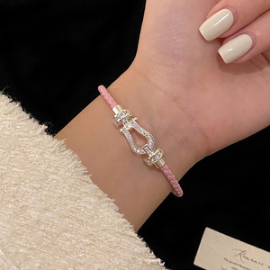 R2569粉色细编绳马蹄扣手链【银白】