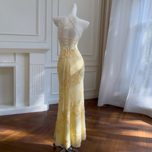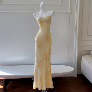 衣阁里拉2025早秋新品柠檬黄抹胸吊带气质收腰长款连衣裙女 69408