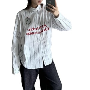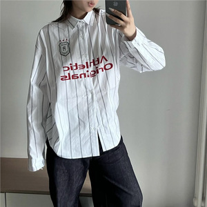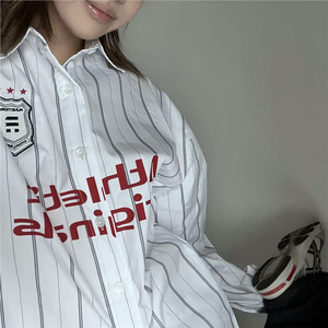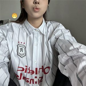 ins秋季新款运动撞色条纹长袖衬衫潮流宽松休闲情侣翻领外穿衬衣
