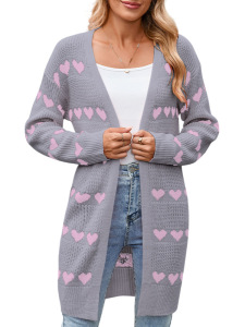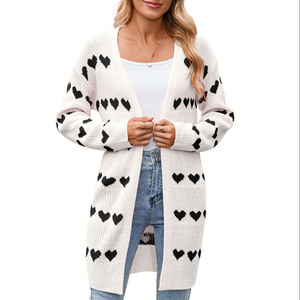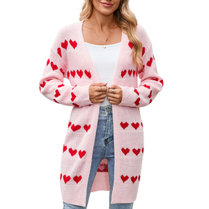 欧美亚马逊秋冬跨境新款情人节V字领爱心提花针织开衫外套毛衣女