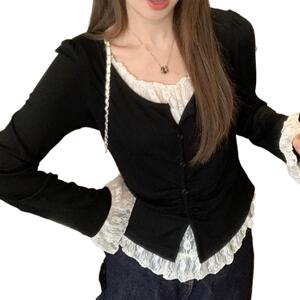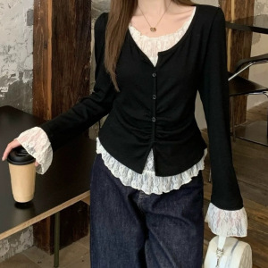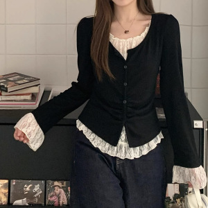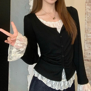 2025现货爆款现货秋季显瘦遮肉蕾丝拼接上衣黑色假两件正肩长袖
