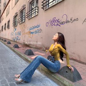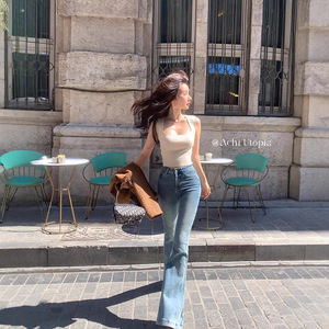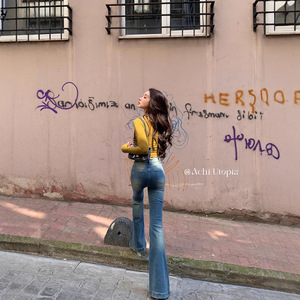 CHI大也池蓝色高腰微喇叭牛仔裤女复古修身显瘦长裤弹力提臀裤子