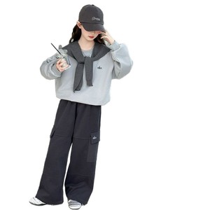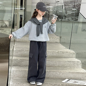女孩拼色时尚叠穿披肩工装裤套装中大童春秋新款复古运动风两件套
