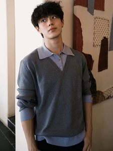 灰色miu系假两件针织衫长袖男女早秋高知老钱风穿搭美式翻领上衣