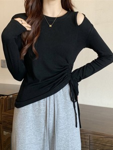 露肩气质长袖t恤女春秋新款修身不规则抽绳打底衫百搭上衣潮A6724