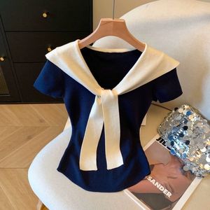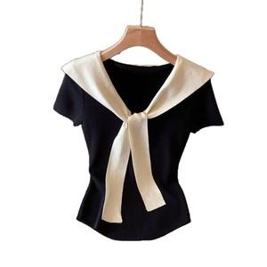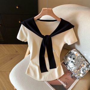 2025夏季新款撞色海军领风假两件拼接披肩短袖T恤女收腰显瘦上衣