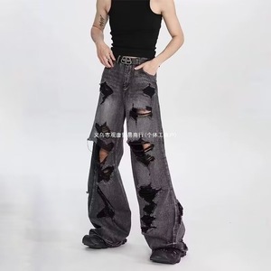 跨境速卖通美式黑色高街破洞牛仔裤女y2k原宿风做旧阔腿拖地裤长