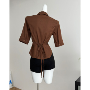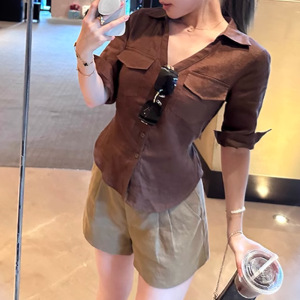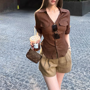 2025秋季 首尔欧尼100亚麻高智感中袖正肩收腰衬衫复古纯色衬衣女
