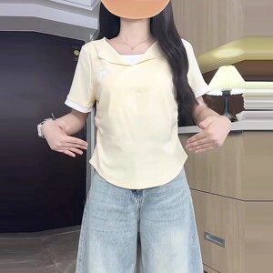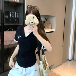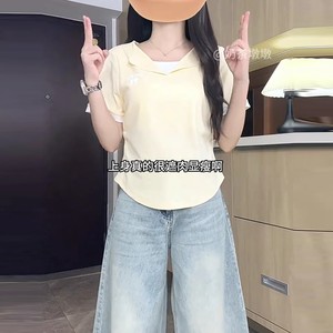 纯欲风大码正肩T恤女时尚翻领显瘦短袖夏季胖MM收腰褶皱刺绣上衣