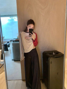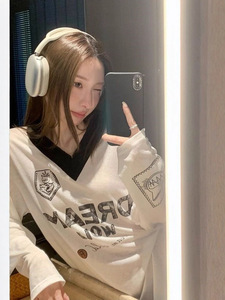 美式复古字母撞色印花V领长袖t恤女早秋2025新款宽松显瘦百搭上衣