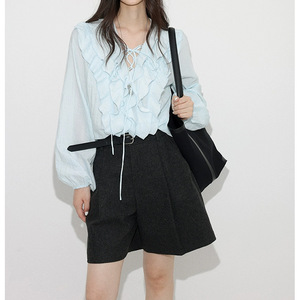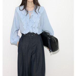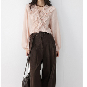 ZHOYUE 法式时髦粉色荷叶边系带上衣女早秋高级感长袖V领衬衫宽松