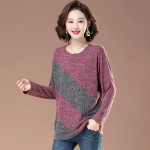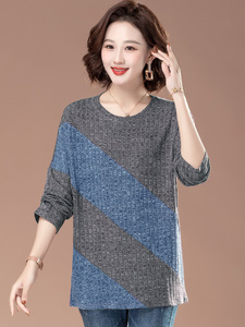 圆领长袖T恤女春秋薄款拼色一字肩打底衫加肥加大码显瘦遮肉上衣