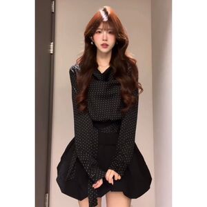 韩式气质波点荡领长袖上衣+黑色半裙套装2025秋季时尚通勤两件套