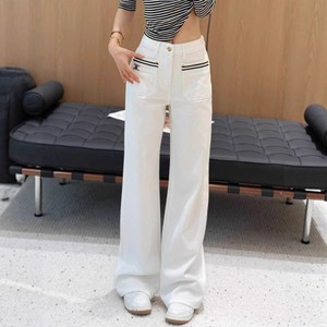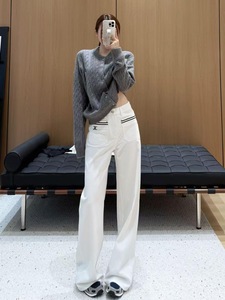 南油凯旋门刺绣双口袋白色牛仔裤女春秋新款设计感显瘦高腰阔腿裤