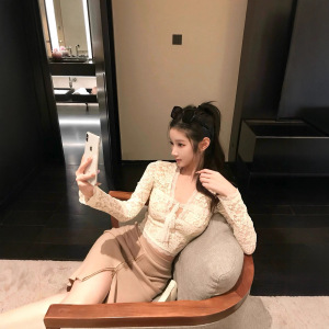 Hotdog 热狗很辣 韩女气质 绑带蕾丝上衣/拉链针织半身裙套装