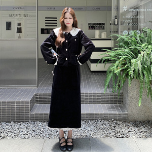 实拍黑色时尚气质丝绒套装裙2025秋款撞色针织领上衣半身裙两件套