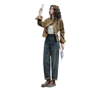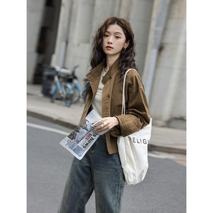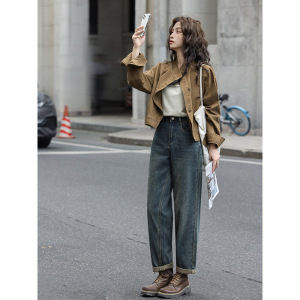 复古咖色牛仔短外套早秋新款小众宽松立领工装夹克上