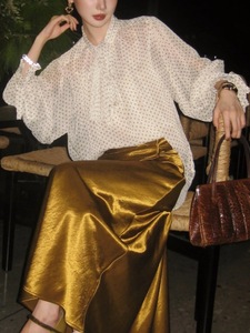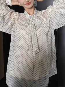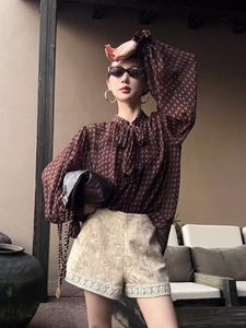 鹭青一钟灵 8.25 20:00 新品复古仿真丝特制印花压褶飘带衬衫