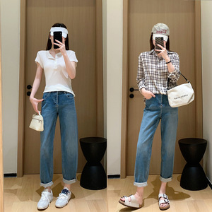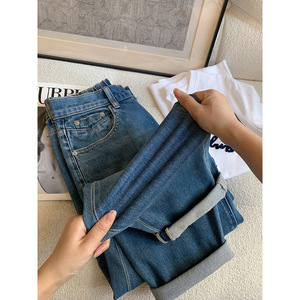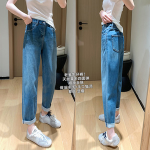 朵妮自制限量!天丝lai卡四面弹做旧水洗猫须老爹裤宽松九分牛仔裤