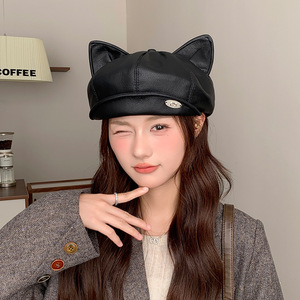2025猫耳朵皮质贝雷帽女韩系甜美百搭鸭舌八角帽时尚画家报童帽