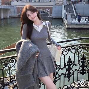 套装女2025秋冬新款韩系学院风修身短款假两件针织上衣高腰半身裙