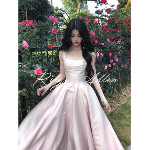 法式新款2025春季高级感千金粉色缎面吊带连衣裙礼服裙大摆蓬蓬裙