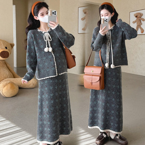 网红同款孕妇装2025秋冬新款时尚小香风提花上衣+半身裙气质套装