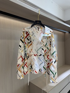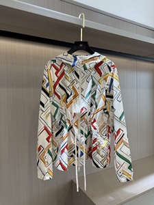 082605 秋季新款女士撞色复古高腰抽绳收腰印花连帽收腰夹克外套