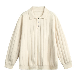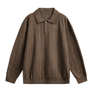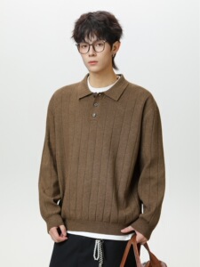 轻熟风坑条肌理翻领毛衣男秋冬款纯色Polo针织衫复古加厚长袖T恤