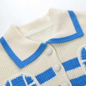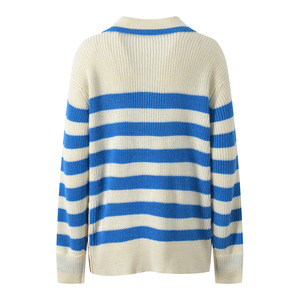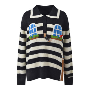 2025秋季新款时尚气质翻领立体刺绣条纹拼色休闲百搭针织衫上衣