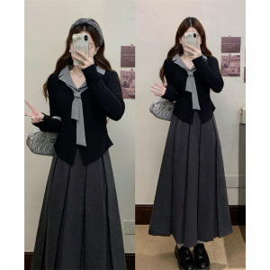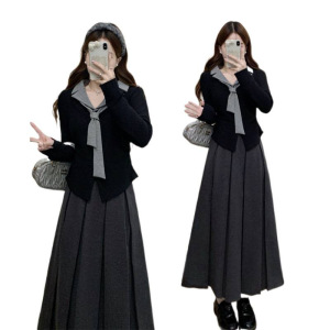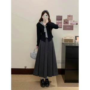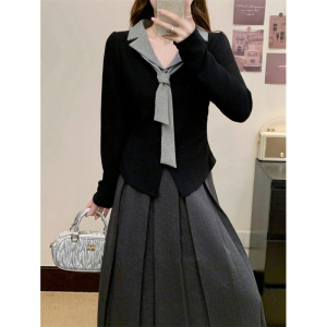 大码秋季新款胖MM韩系设计感灰色上衣高腰半身裙气质两件套装女