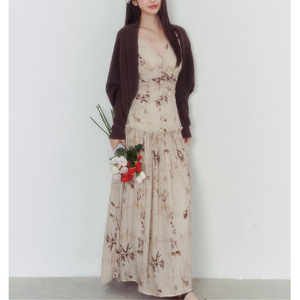 2025秋季法式蝴蝶印花V领碎花连衣裙+蝙蝠袖显瘦慵懒羊毛针织外套