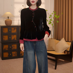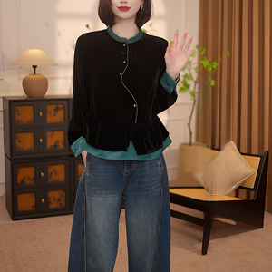 国风新中式撞色上衣2025秋季新款设计感木耳拼接立领长袖丝绒小衫