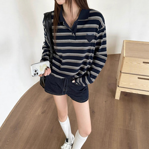 老钱风穿搭条纹打底衫女秋季流行穿搭polo衫早秋韩系chic别致上衣