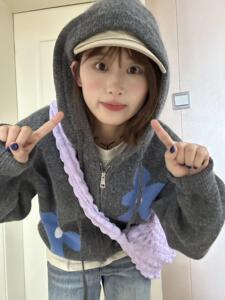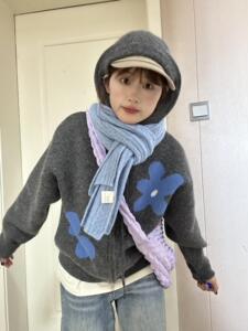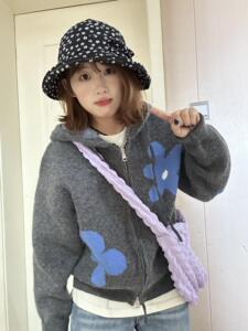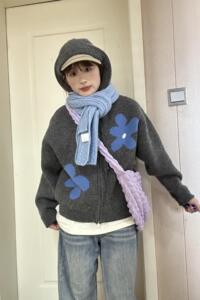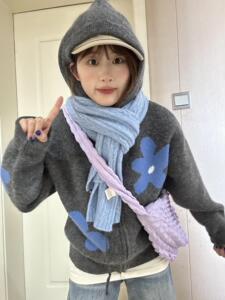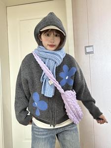 韩系连帽针织开衫毛衣女秋冬外搭宽松慵懒风拉链休闲卫衣外套上衣