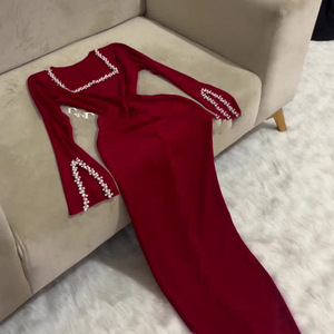 2025年秋季新款欧美亚马逊跨境外贸女装气质轻奢镶钻红色优雅长裙