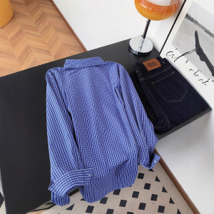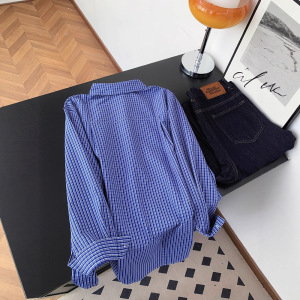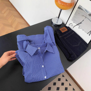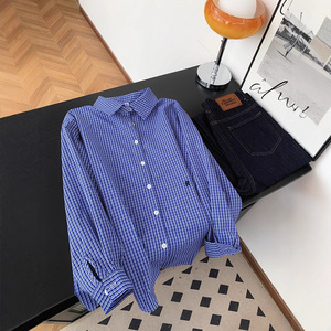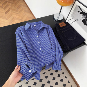 广州十三行高货爆款~慵懒风时尚精致百搭衬衣女蓝色格子长袖衬衫