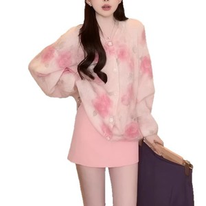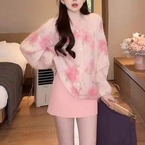 温柔风粉色花朵针织开衫女2025秋季新款宽松显瘦百搭毛衣外套上衣