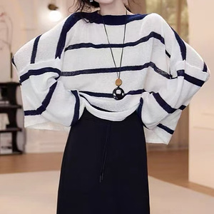 休闲松弛感撞色条纹圆领长袖针织衫女秋季新款洋气小个子宽松上衣