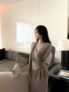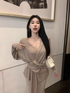 大码女装秋季慵懒风交叉V领长袖针织衫+高腰鱼尾半身裙气质两件套