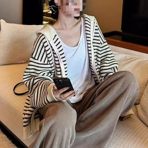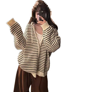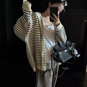秋冬宽松百搭软糯韩系抽绳条纹连帽慵懒风拉链毛衣外套女针织上衣