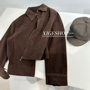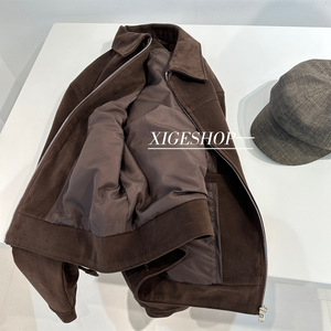 深咖仿牛反绒复古翻领夹克上衣女宽松显瘦正肩麂皮绒感短外套秋季