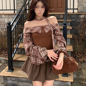 美式复古一字肩长袖格子拼接修身上衣高腰显瘦字短裙两件套绑带