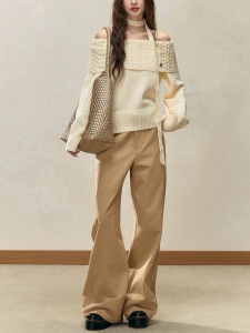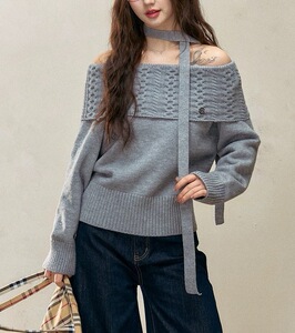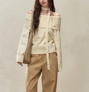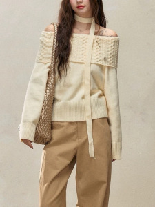 秋季新款麻花挂脖毛衣女慵懒风修身设计感一字肩上衣