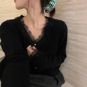 毛衣秋季女装宽松慵懒上衣女高级感超好看蕾丝V领内搭针织打底衫