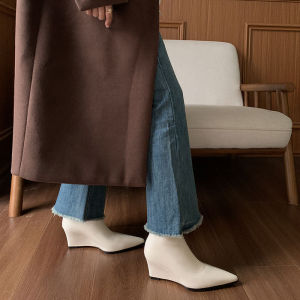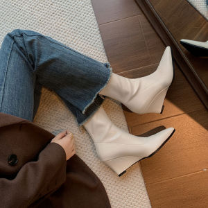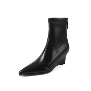 坡跟短靴女瘦瘦靴子秋冬新款皮革尖头后拉链高跟靴女弹力短靴女靴