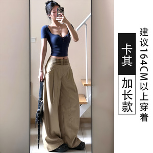 卡其色美式拼接格纹休闲裤女秋季2025新款设计感慵懒风垂感阔腿裤