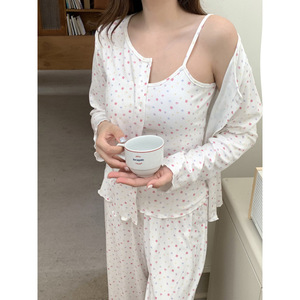 韩国 ins秋冬韩系碎花磨毛针织棉家居服睡衣三件套带胸垫